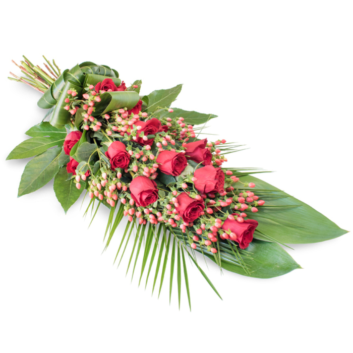 Deliver your deepest sympathies with our sophisticated flower spray crafted from lush red roses and elegant red hypericum. This distinctive arrangement is designed to offer comfort and beauty in times of need.